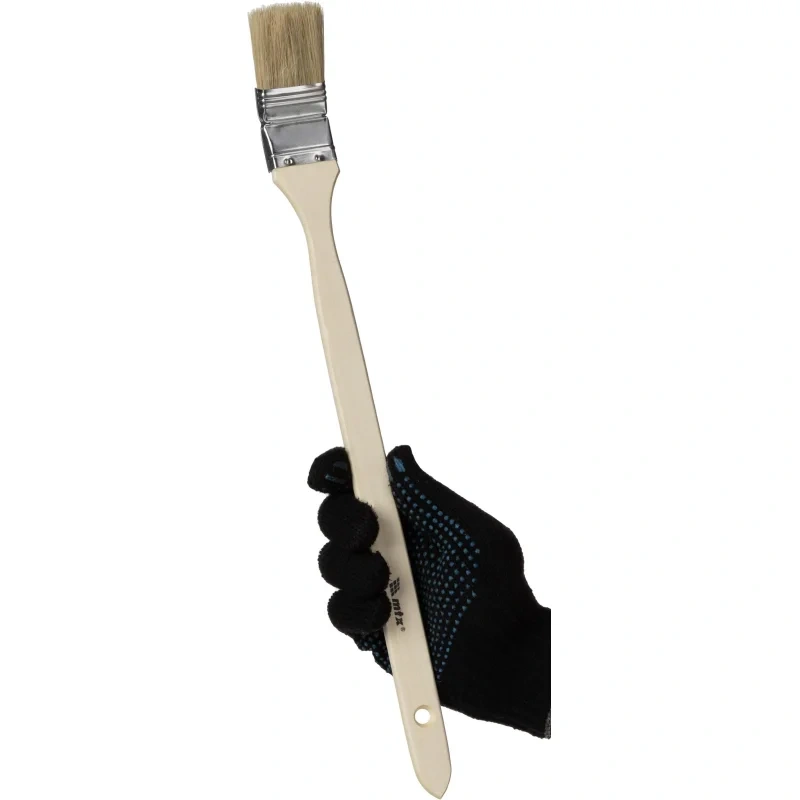 Кисть предназначена для работ с масляными красками и лаками, устойчива к агрессивным составам. Она применяется для выполнения малярных работ в труднодоступных местах. Подходит для окрашивания отопительных радиаторов, труб и поверхностей за ними. Ворс кисти сделан из натуральной щетины двойной выварки. Щетина расщеплена на концах и надежно закреплена металлическим бандажом с антикоррозийным покрытием. Деревянная ручка имеет удлиненную форму и не скользит в руке. Ширина кисти составляет 38 мм, толщина ворса: 8 мм. Длина кисти: 434 мм.