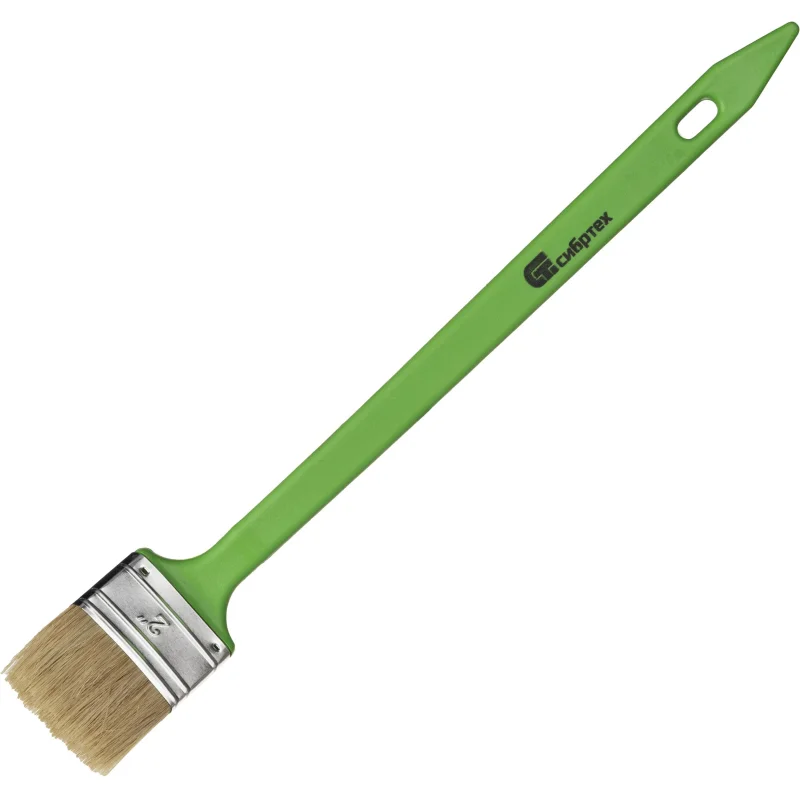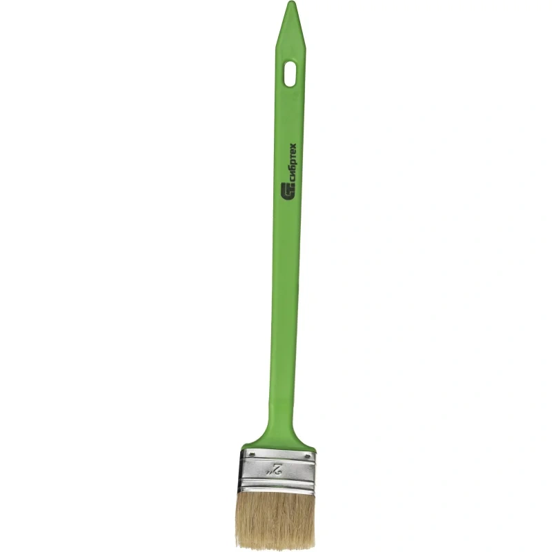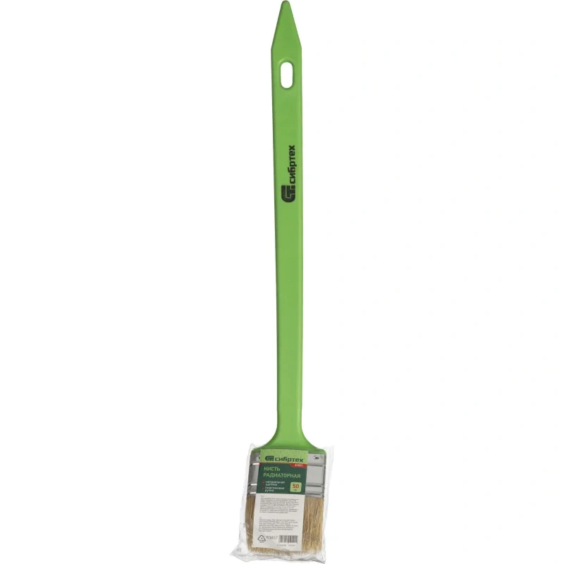 Радиаторная кисть предназначена для выполнения малярных работ в труднодоступных местах, окраски отопительных радиаторов, труб, поверхностей за радиаторами. Она используется для работы с масляными красками и лаками. Кисть изготовлена из натуральной щетины. Пластиковая ручка Сибртех имеет специальную удлиненную изогнутую форму, что значительно облегчает работу с кистью. Нержавеющий металлический бандаж надежно скрепляет рабочую часть кисти с рукояткой, исключая выпадение щетины. Ширина изделия составляет 50 мм, толщина ворса: 8 мм. Длина кисти составляет 365 мм.