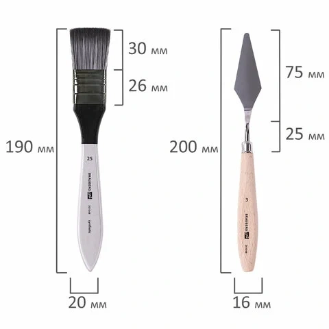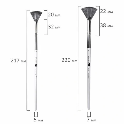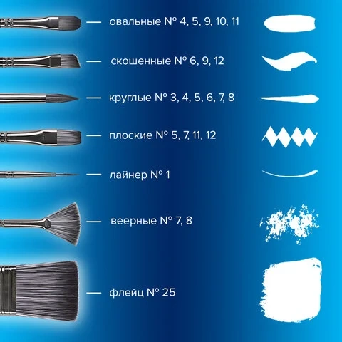 | Номер кисти | скошенные - № 6, 9, 12; веерная - № 7, 8; лайнер - № 1; овальные - № 4, 5,9, 10, 11; флейц - № 25; п |