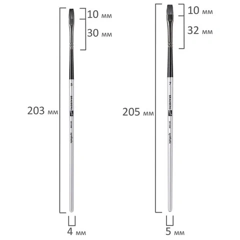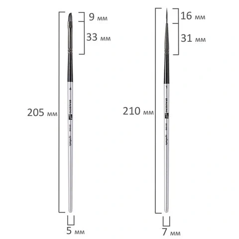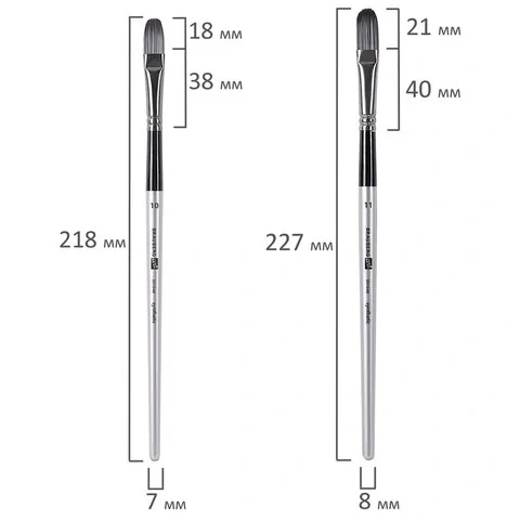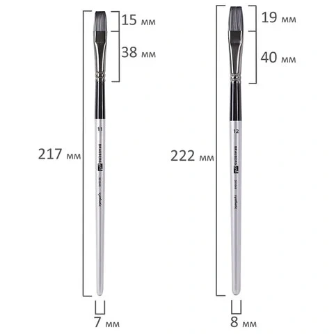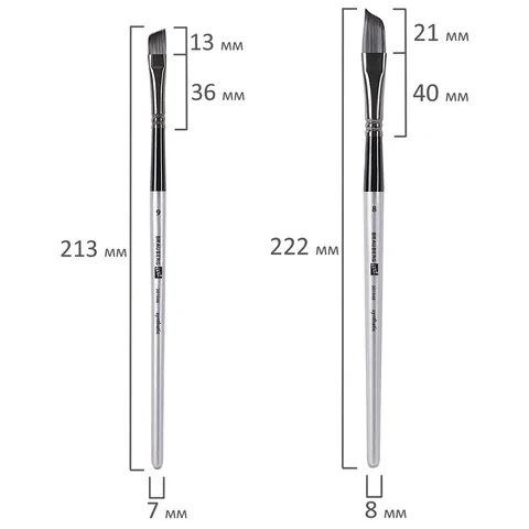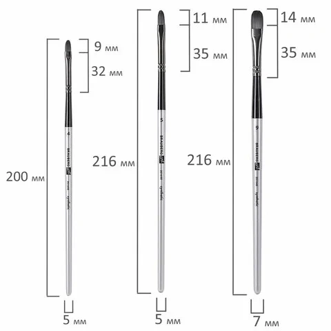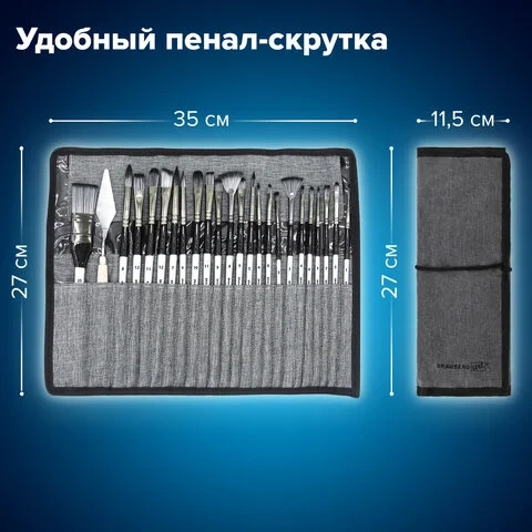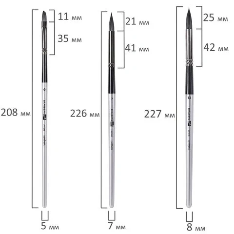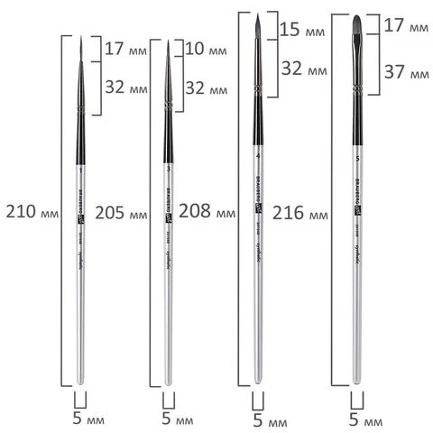 Формы кистей: скошенные – № 6, 9, 12, веерная – № 7, 8, лайнер – № 1, овальные – № 4, 5, 9, 10, 11, флейц – № 25, плоские – № 5, 7, 11, 12, круглые – № 3, 4, 5, 6, 7, 8. Номер кисти соответствует реальной ширине пучка в миллиметрах. Упаковка – текстильный пенал-скрутка.
