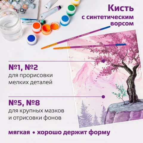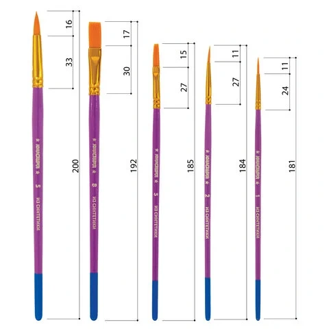 Кисти из высококачественного синтетического ворса отлично впитывают и отдают краску, хорошо держат форму, долговечны и надежны. Благодаря кистям №1 и 2 ребенку будет комфортно прорисовывать мелкие детали. Кисти № 5 и 8 и позволят делать более крупные мазки и линии. Рукоятку кисти удобно держать в руке.