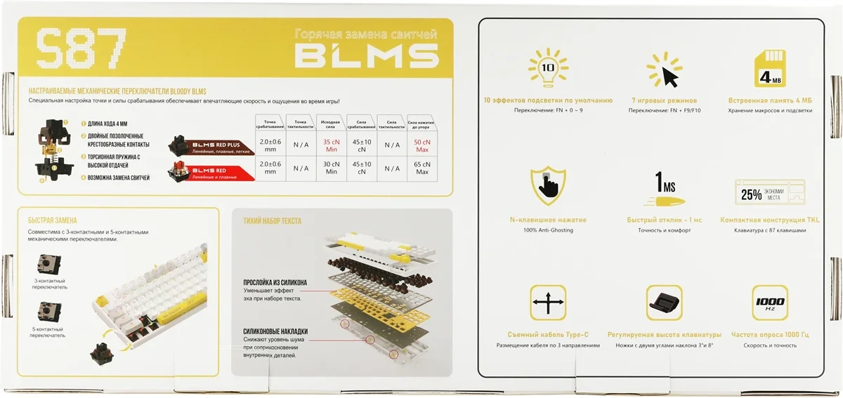 Клавиатура A4Tech Bloody S87 Energy механическая белый/желтый USB for gamer LED (S87 USB ENERGY WHIT