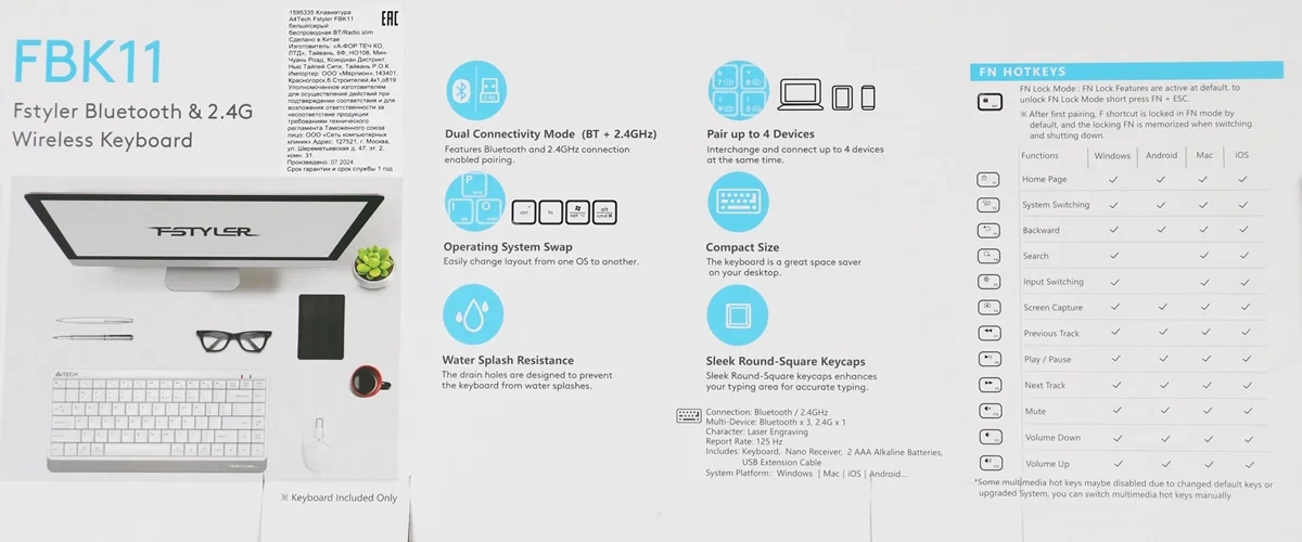 Клавиатура A4Tech Fstyler FBK11 белый/серый USB беспроводная BT/Radio slim (FBK11 WHITE)