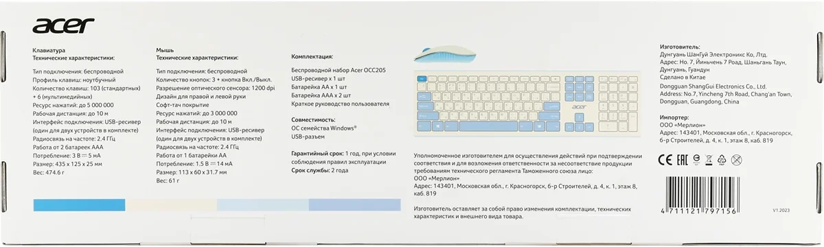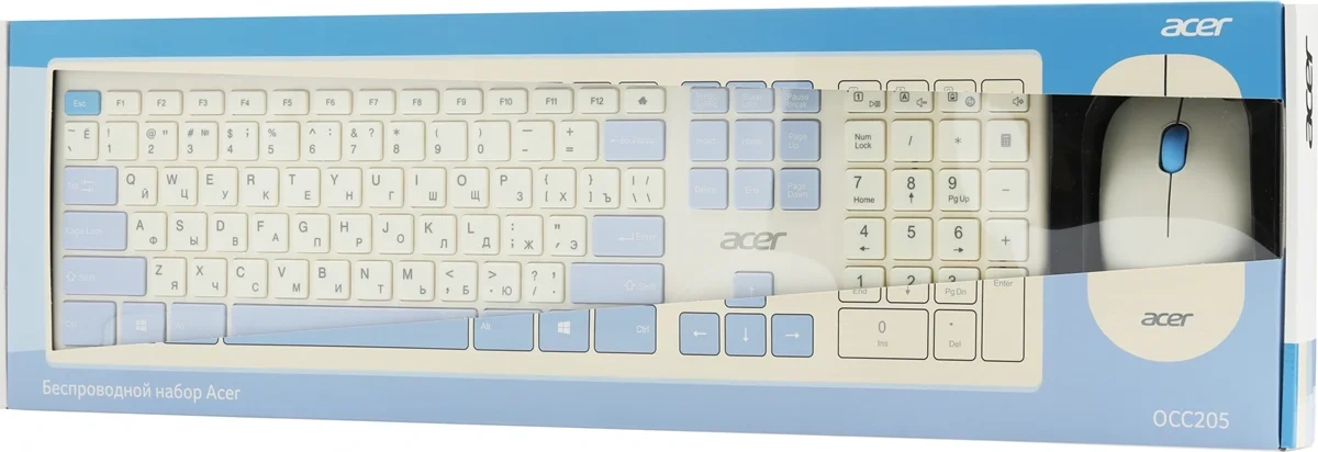 Клавиатура + мышь Acer OCC205 клав:белый/голубой мышь:белый/голубой USB беспроводная slim Multimedia