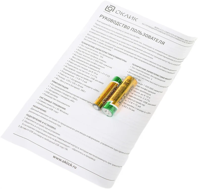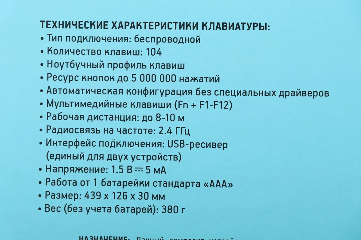 | Комплект поставки | беспроводная компьютерная клавиатура и мышь 240m, 2 батарейки стандарта «aaa», 1 батарейка стандарта |
