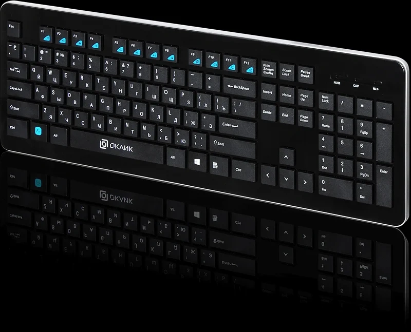 Клавиатура OKLICK 870S – компактная и функциональная модель, работающая по беспроводной связи. Она отличается классическим дизайном, сочетающим сверхтонкую slim-конструкцию, эргономичную форму и универсальную черную расцветку. Благодаря большому количеству кнопок обеспечивается комфортное управление опциями. Наличие мультимедиа клавиш способствует регулированию настроек звука и изображения в играх и различных приложениях. Также предусматриваются кнопки островного типа. Клавиатура OKLICK 870S имеет плавных ход, благодаря чему при наборе текста не создается эффект печатной машинки. Подключение к компьютеру выполняется при помощи USB-передатчика, обеспечивающего функционирование устройства на расстоянии до 10 метров. Для удобства пользователя, помимо английской раскладки, предусмотрена русская.