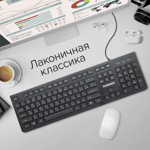 Клавиатура проводная SONNEN KB-8280, USB, 104 плоские клавиши, черная, 513510