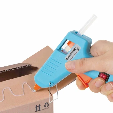 Рабочая температура пистолета: 130-272 °C. 20 клеевых стержней (10 белых и 10 прозрачных) в комплекте. Корпус изготовлен из ударопрочной пластмассы и имеет скобу для надежной установки в нерабочем положении. Имеется защитный механизм от протекания клея. Используется клеевой пистолет, в основном, в быту, там, где нужно что-то подклеить в небольшом объеме, например, для декорирования или изготовления упаковочной и сувенирной продукции. Удобен для работы с малогабаритными изделиями.