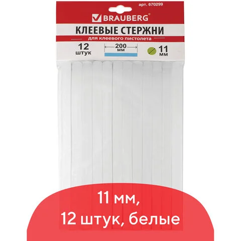 Клеевой стержень Brauberg белый, d=11мм, 200мм, 12шт