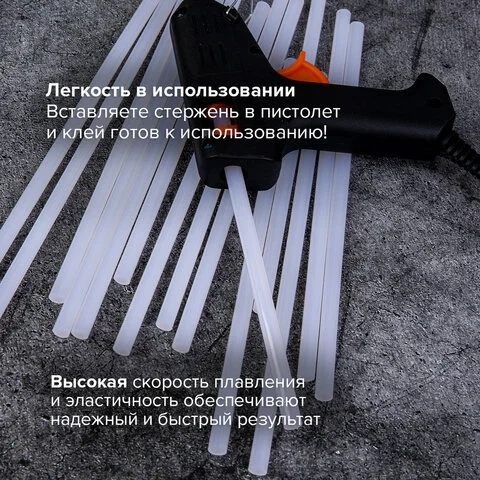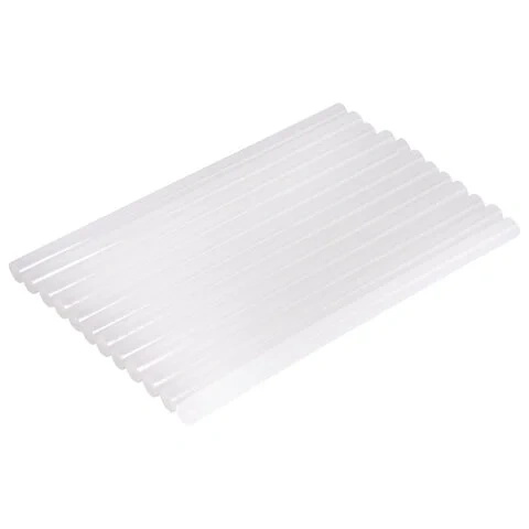 Термоклей прочно и быстро скрепит различные материалы: бумагу, дерево, картон, стекло, пластмассу, металл, кожу, синтетические волокна и т. д. Диаметр клеевого стержня 11 мм и длина 20 см являются самыми востребованными параметрами для выполнения работ. Цвет клеевого стержня белый. В комплект входит 12 клеевых стрежней, обеспечивающих непрерывный рабочий процесс.