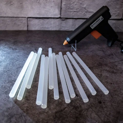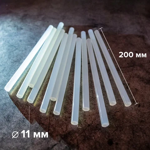 Термоклей прочно и быстро скрепит различные материалы: бумагу, дерево, картон, стекло, пластмассу, металл, кожу, синтетические волокна и т. д. Диаметр клеевого стержня 11 мм и длина 20 см являются самыми востребованными параметрами для выполнения работ. Прозрачный цвет обеспечивает невидимость при соединении предметов. В комплект входит 12 клеевых стрежней, обеспечивающих непрерывный рабочий процесс.