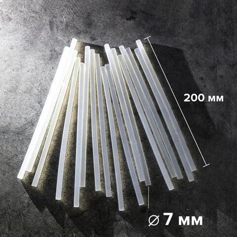 Термоклей прочно и быстро скрепит различные материалы: бумагу, дерево, картон, стекло, пластмассу, металл, кожу, синтетические волокна и т. д. Диаметр клеевого стержня 7 мм и длина 20 см являются самыми востребованными параметрами для выполнения работ. Прозрачный цвет обеспечивает невидимость при соединении предметов. В комплект входит 12 клеевых стрежней, обеспечивающих непрерывный рабочий процесс.