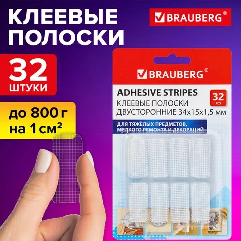 Клеевые полоски двусторонние, 34х15 мм, акриловая основа, 32 шт., BRAUBERG, 608778