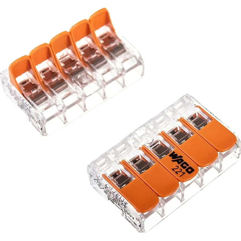 Клемма WAGO 2273-205 5-проводная без пасты (100 штук в упаковке) предназначены для соединения для подключения одножильных/многожильных медных проводников (до 3-го класса гибкости). Сечение соединяемых одножильных проводов 0.5-2.5 мм², с помощью плоско-пружинного зажима.