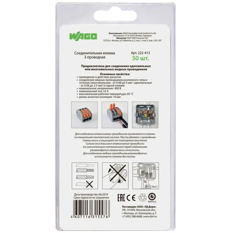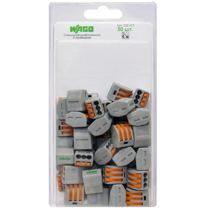 Клемма WAGO 222-413 3-проводная с рычагом (50 штук в упаковке)
