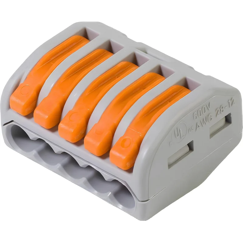 Клемма WAGO 222-415 5-проводная с рычагом (40 штук в упаковке) — это приспособление для подключения проводов в распределительную коробку. Клемма имеет прочный пластиковый корпус, который подходит для установки 5 кабелей одновременно. Изделие не требует использования дополнительных инструментов, так как оснащено рычажком открытия и закрытия клеммы.