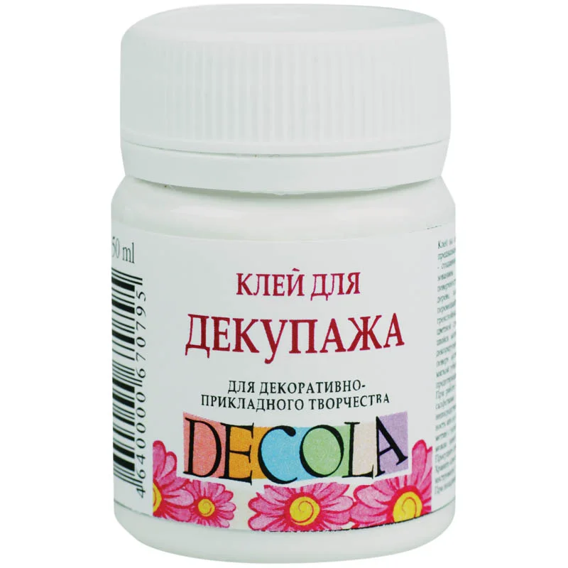 Клей для декупажа серии «DECOLA» на основе водной дисперсии поливинилацетата (ПВА) предназначен для работы в технике «декупаж» - создании декоративных изделий с использованием бумажных салфеток или специальных салфеток для декупажа на любой поверхности (например, холсте, картоне, бумаге, стекле, дереве, коже).