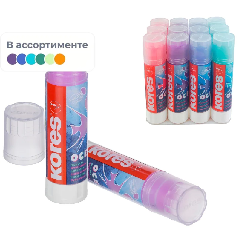 Клей-карандаш 10г Kores Ocean ассорти:прозрачный син, голуб, фиол,розов