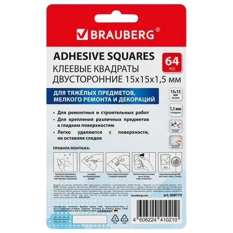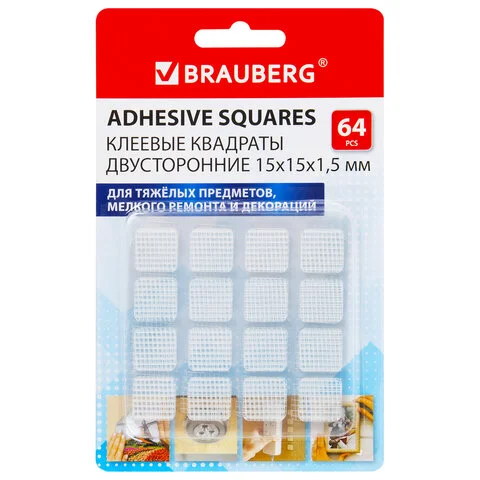 Клеевые квадраты двусторонние, 15х15 мм, акриловая основа, 64 шт., BRAUBERG, 608779