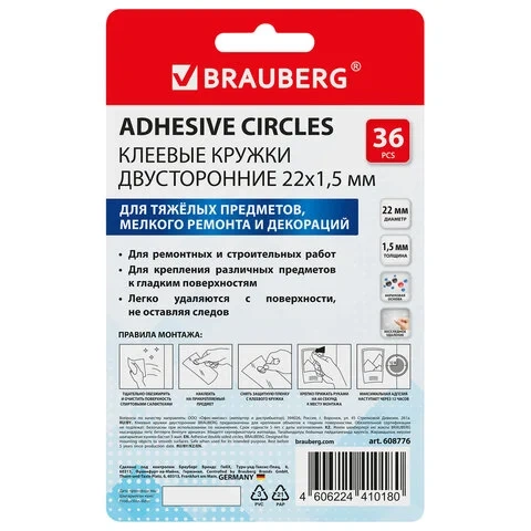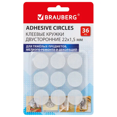 Клеевые кружки двусторонние, диаметр 22 мм, акриловая основа, 36 шт., BRAUBERG, 608776