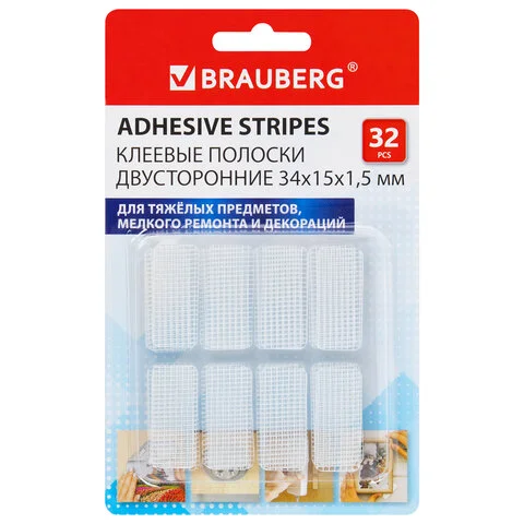 Клеевые полоски двусторонние, 34х15 мм, акриловая основа, 32 шт., BRAUBERG, 608778
