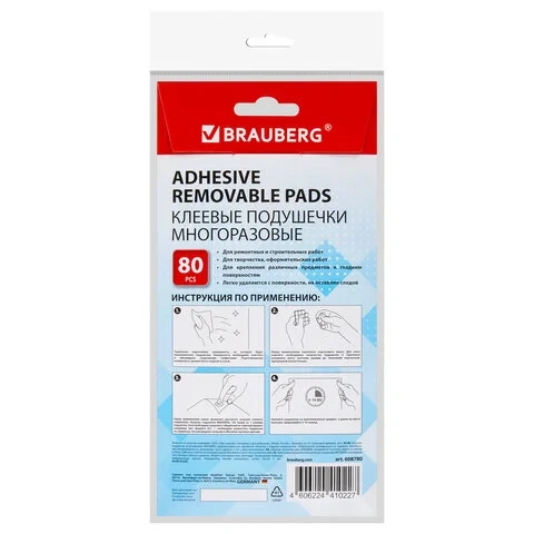 Клеевые подушечки многоразовые BRAUBERG, 80 шт., бесследное удаление, белые, 608780
