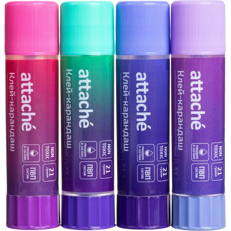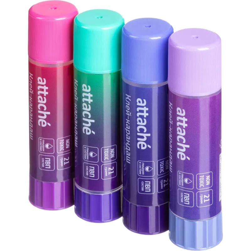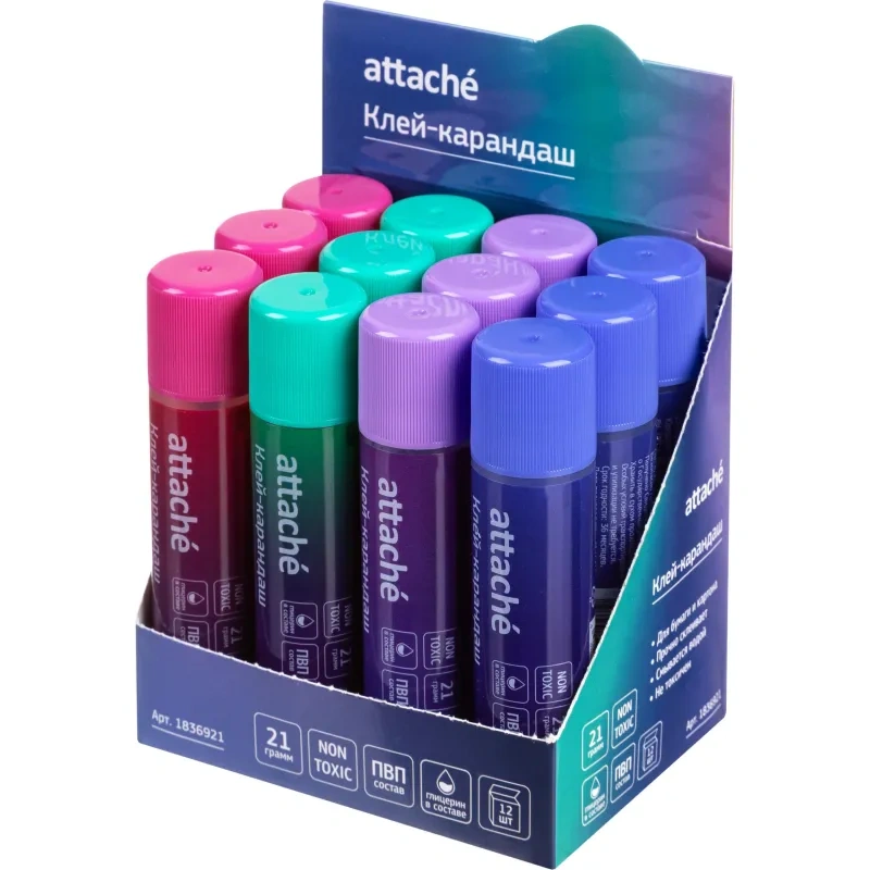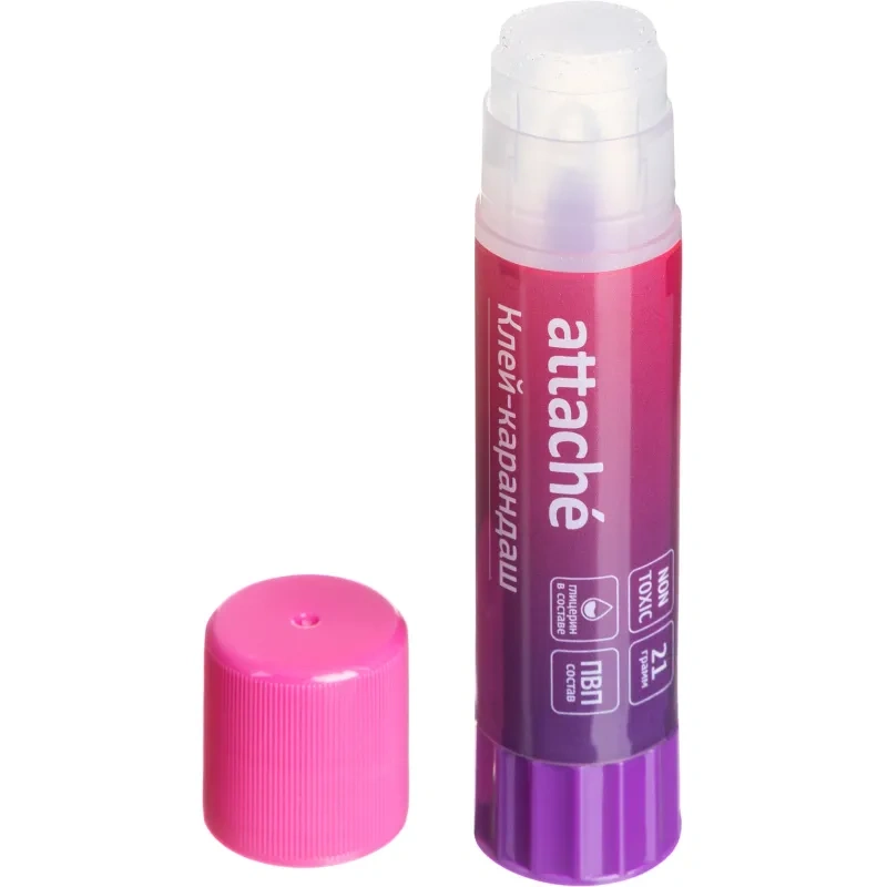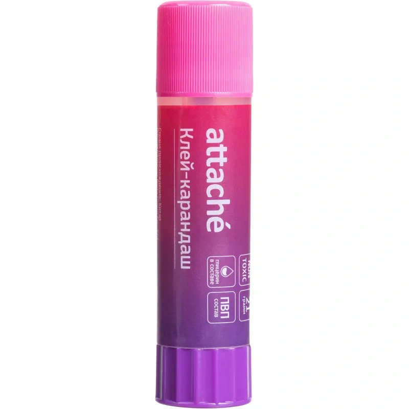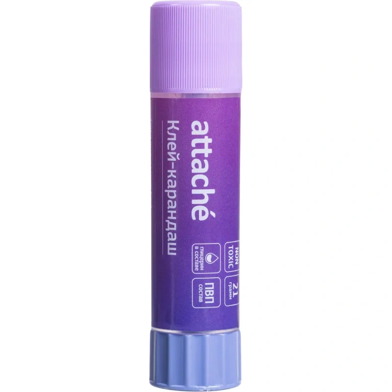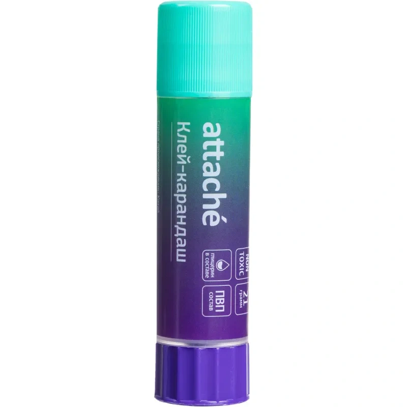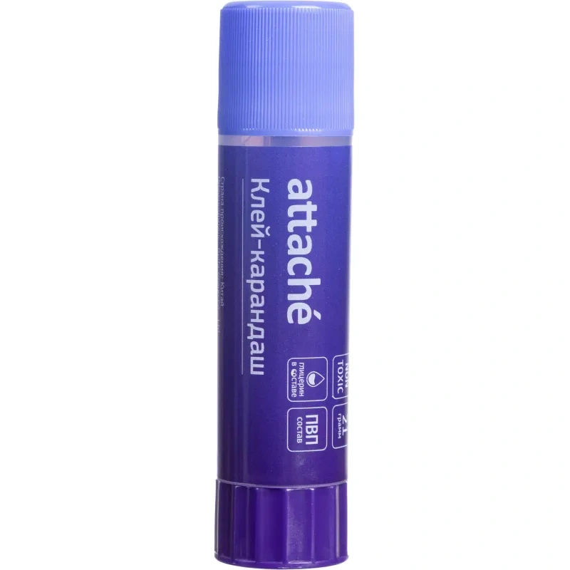 Клей-карандаш Attache предназначен для склеивания картона, бумаги, текстиля для бумаги. Вес — 21 г. Форма корпуса: круглая. Не содержит цветовых пигментов (бесцветный). Изготовлен из поливинилпирролидона.