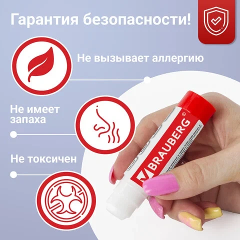 После нанесения высыхает без образования пятен. Не токсичен, не вызывает аллергии и безопасен для здоровья. Легко наносится и распределяется по поверхности, оставляя тонкий и ровный клеевой слой, что позволяет расходовать его экономично. Клей удобен в использовании. Он не пачкает руки, стол, одежду, не попадает на участки бумаги, расположенные возле места склеивания. Увеличенный срок годности — 5 лет.