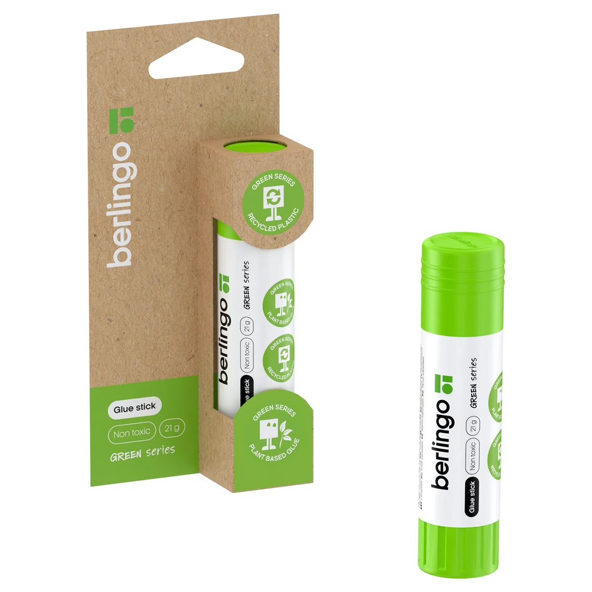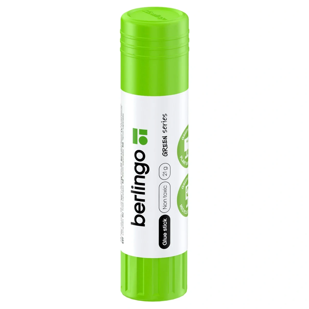 Клей-карандаш Berlingo 'Green Series'. Объем - 21 г. Клей-карандаш имеет безопасную формулу, в основу которой входят натуральные компоненты - кукурузный крахмал и вода. Корпус выполнен из переработанного пластика. Подходит для склеивания изделий из бумаги, картона, ткани, фотографии. Легко наносится и распределяется на поверхности равномерным слоем, не деформируя обрабатываемый материал. Благодаря равномерному нанесению клей расходуется экономично. Надежный колпачок предохраняет от высыхания. Упаковка - блистер из крафтового картона с европодвесом.
