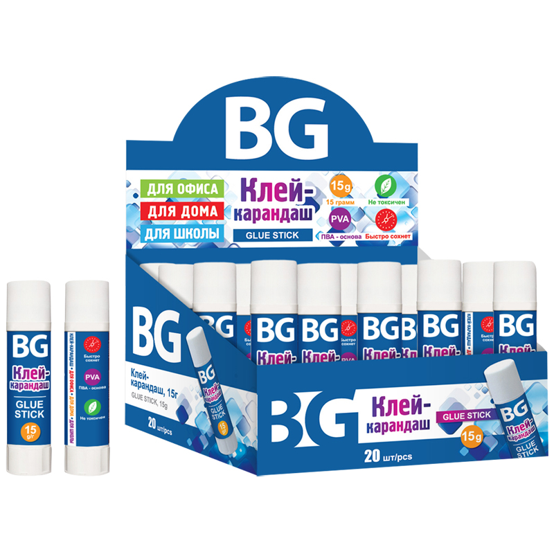 Клей-карандаш BG идеально подходит для склеивания бумаги, картона, фотографий и ткани. Выкручивающийся механизм обеспечивает постепенное выдвижение клеящего стержня из пластикового корпуса. Клей быстро сохнет, не оставляет следов после высыхания, не содержит растворителей, подходит для офиса и детского творчества. В комплекте 20 штук, упакованных в фирменный шоубокс.