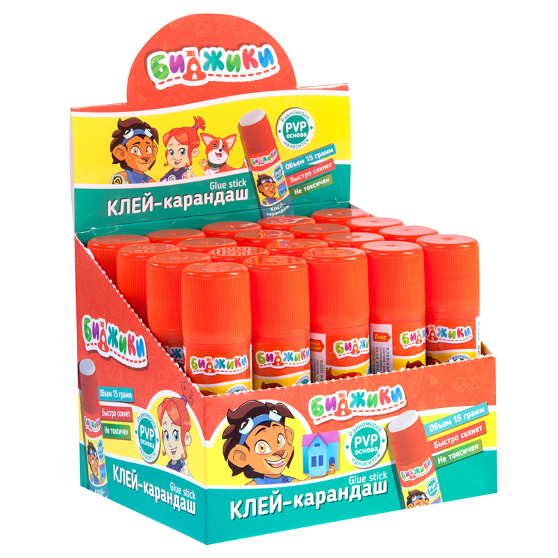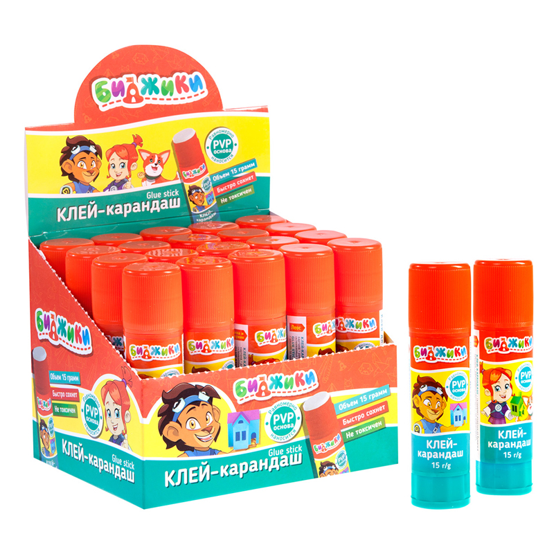 Клей-карандаш БИДЖИКИ идеально подходит для склеивания бумаги, картона, фотографий и ткани. Выкручивающийся механизм обеспечивает постепенное выдвижение клеящего стержня из пластикового корпуса. Клей быстро сохнет, не оставляет следов после высыхания, не содержит растворителей, подходит для офиса и детского творчества. В основе клея-карандаша PVP лежит натуральное вещество глицерин, в отличие от PVА - на основе глицерола (синтетическое вещество). Клей на основе PVP имеет более высокие клеящие свойства, гладкое скольжение при нанесении и, как следствие, меньший расход. В комплекте 20 штук, упакованных в фирменный шоубокс.