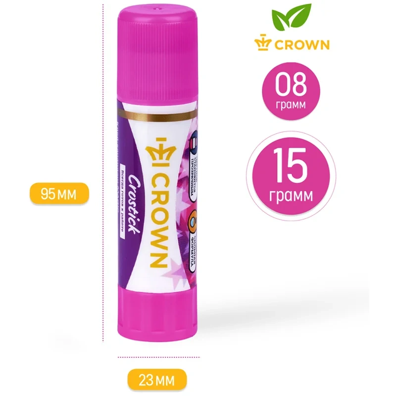 Клей-карандаш Crown 'Indicator', 15г легко наносится и распределяется на поверхности тонким и равномерным слоем, не деформируя обрабатываемый материал. Клей Crown 'Indicator' содержит специальный цветной пигмент, хорошо заметный при нанесении. По мере высыхания клея пигмент обесцвечивается. Благодаря равномерному нанесению клей расходуется экономично. Подходит для склеивания бумаги, картона, ткани, фотографий, блесток и использования в различных подделках. Надежный колпачок предохраняет от высыхания в течение трех лет.