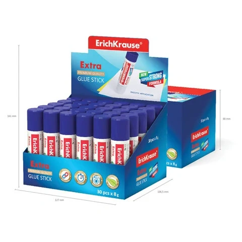 Клей-карандаш Extra c новой суперсильной формулой на PVP-основе с экономичным расходом, максимально быстрым и надежным склеиванием. Легко смывается водой. Не токсичен. Не содержит растворителя. Морозостоек. Подходит для бумаги, картона и ткани.