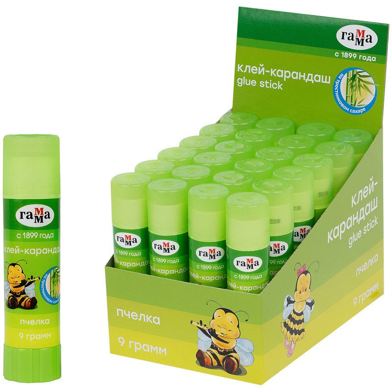 Клей-карандаш ПВП ГАММА серии «Пчёлка» – отличный помощник на уроках труда и для изготовления различных поделок! Вес – 9 граммов. Прозрачный клей легко и равномерно наносится на поверхность тонким слоем, что позволяет экономично его расходовать. Позволяет хорошо склеивать изделия из бумаги, картона, фотографии, ткани, блёсток. Он безопасен даже для самых маленьких детей, так как состоит исключительно из натуральных компонентов: клей изготовлен на основе тростникового сахара и нетоксичен. Круглый корпус удобно лежит в руке. Поставляется в дисплей-боксах.
