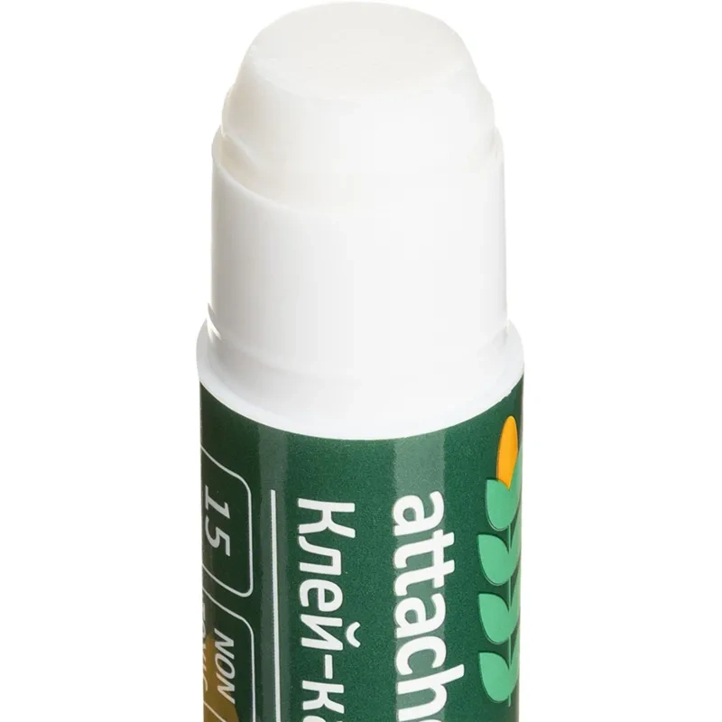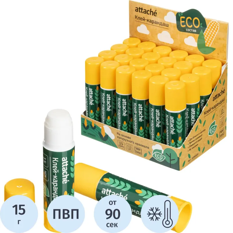 Клей-карандаш Attache ECO-состав имеет особую безопасную формулу, в основу которой входят натуральные компоненты — кукурузный крахмал и вода. Клей не имеет запаха, нетоксичный и отстирывается в холодной воде. Легко наносится и распределяется на поверхности тонким прозрачным слоем, не деформируя обрабатываемый материал. Благодаря равномерному нанесению клей расходуется экономично. Надёжный колпачок препятствует высыханию клея в течение трёх лет.