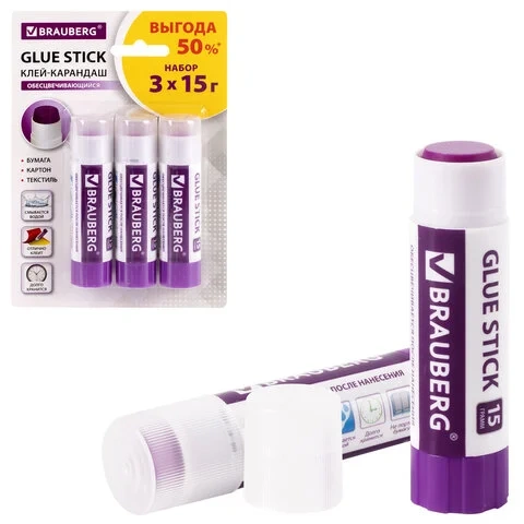 Клей-карандаш обесцвечивающийся BRAUBERG 15 г, 3 штуки на блистере, 229473