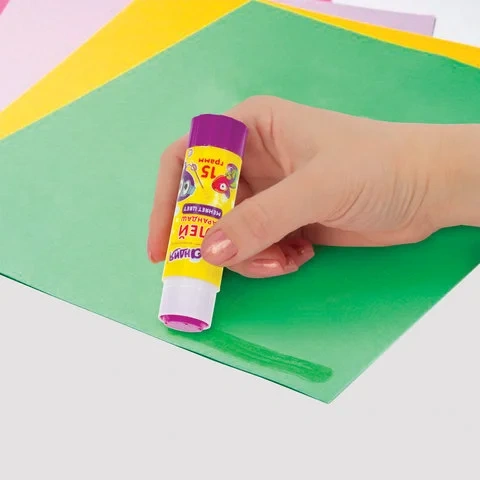 При склеивании цветной пигмент исчезает со склеиваемой поверхности, не оставляя следов. Обесцвечивающийся индикатор позволяет на некоторое время сделать видимой клеевой слой для удобства. Безопасен при использовании, не содержит токсичных веществ. Не деформирует бумагу.