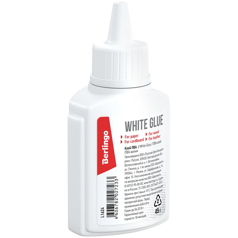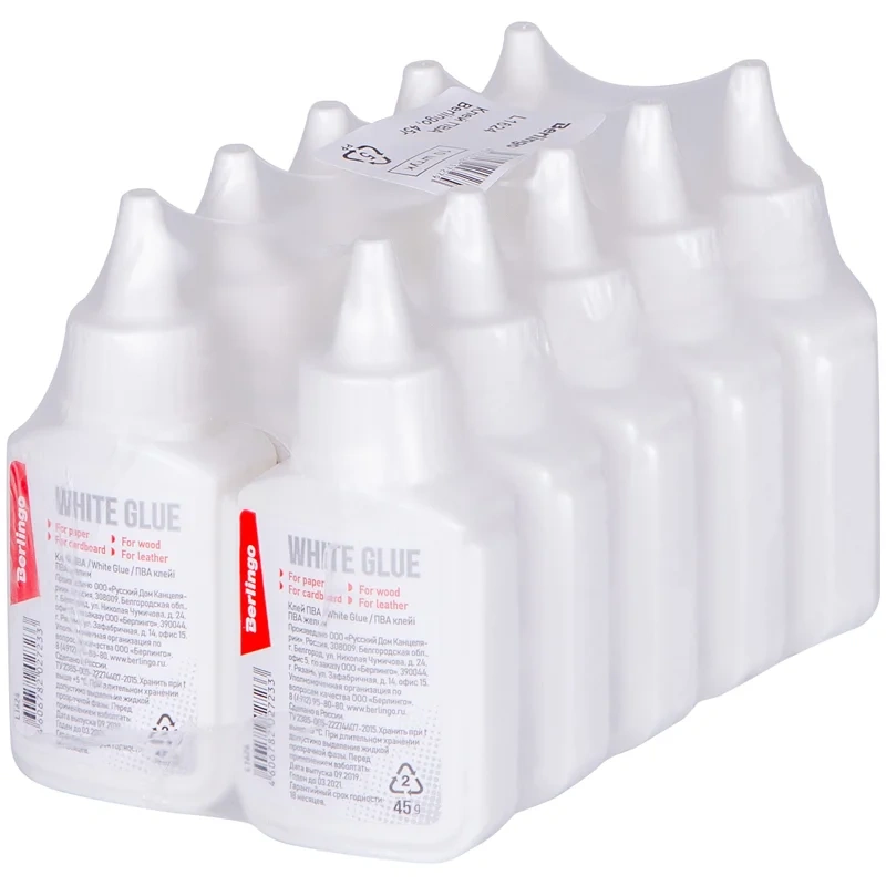 Клей ПВА Berlingo предназначен для склеивания бумаги, картона, дерева, стекла, кожи, ткани. Вес - 45 граммов. В термоусадке по 10 штук. Клей морозостойкий. Выдерживает 5 циклов заморозки/разморозки при температуре до -40°С, сохраняя при этом однородность текстуры и потребительские свойства. Упаковка не деформируется при низких температурах. Хранить при температуре свыше +5°С. Удобный флакон с дозатором, который обеспечивает экономичный расход клея. Не содержит растворителя. Не оставляет следов и легко смывается водой.