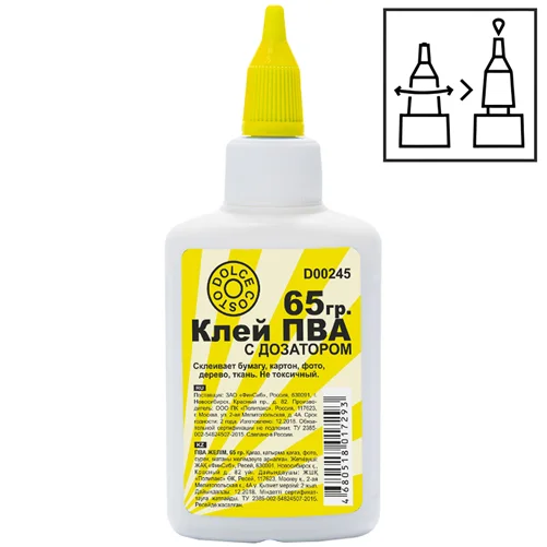 Клей ПВА DOLCE COSTO во флаконе с дозатором, 65 г., предназначен для склеивания бумаги, картона, фото, дерева, ткани. Рекомендуется для офиса, школы, творчества. Не требует особого температурного режима транспортировки. Сохраняет клеящие свойства вплоть до пяти циклов заморозки. Оптимальные условия использования: при комнатной температуре.