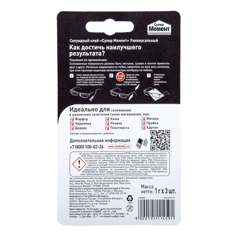 Клей универсальный секундный Момент Мини-трио предназначен для склеивания различных видов пластмасс, резины, металлов, дерева, фарфора, керамики, кожи, пробки, тканей, картона и бумаги. Не пригоден для склеивания полипропилена, полиэтилена, политетрафторэтилена (тефлона), стекла, глазированных поверхностей и силиконовой резины. Не пригоден для склеивания полипропилена, полиэтилена, политетрафторэтилена (тефлона), стекла, глазированных поверхностей и силиконовой резины. Не применим для склеивания посуды, в которую будет наливаться горячая жидкость и посуды, которая может контактировать с пищей.