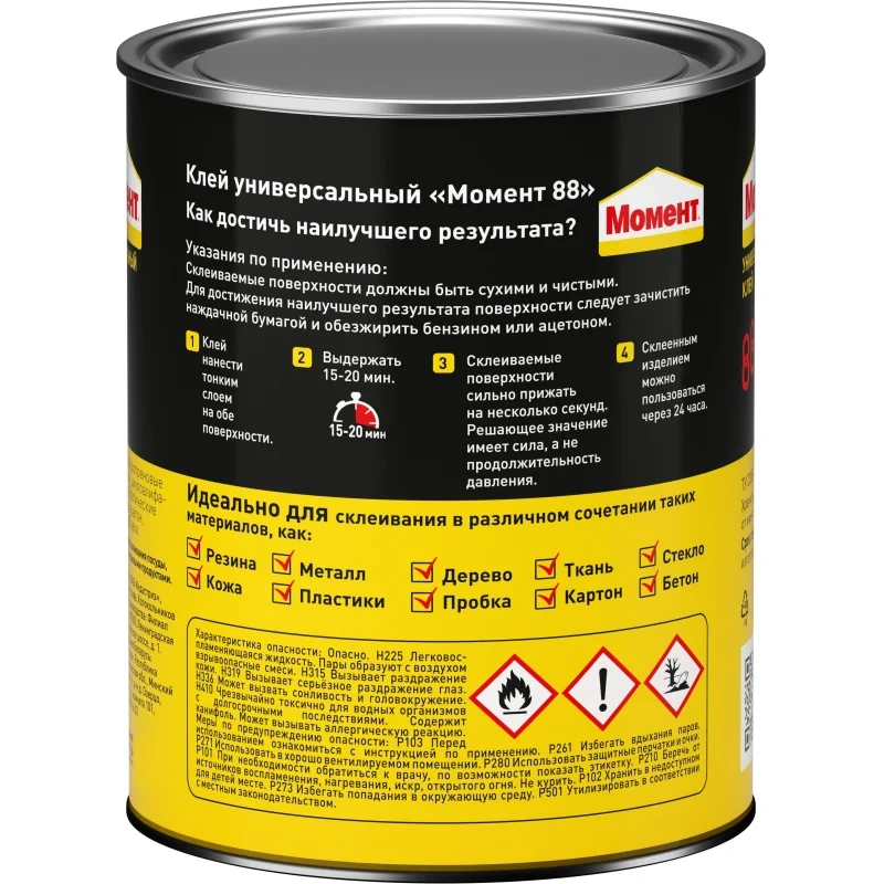Клей универсальный Момент 88 особопрочный водостойкий 750 мл — отличное решение для повышенных требований. Это универсальный контактный клей, устойчивый к воздействию воды, мороза, старению и гарантирующий высокую прочность склеивания.