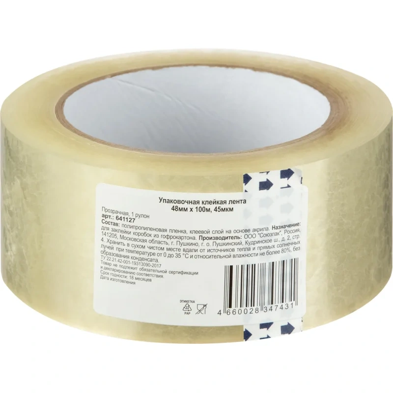 Упаковочная клейкая лента толщиной 45 мкм изготовлена на основе прозрачного полипропилена. Отличается высокой адгезией клея (слипанием с поверхностью), стойкостью к разрыву. Ширина ленты — 48 мм, длина рулона — 100 м. Широкая клейкая лента предназначена для упаковки объемных и тяжеловесных грузов, не теряет свойств на открытом воздухе при температуре от 10 до 30°C. Не хранить под прямыми солнечными лучами.