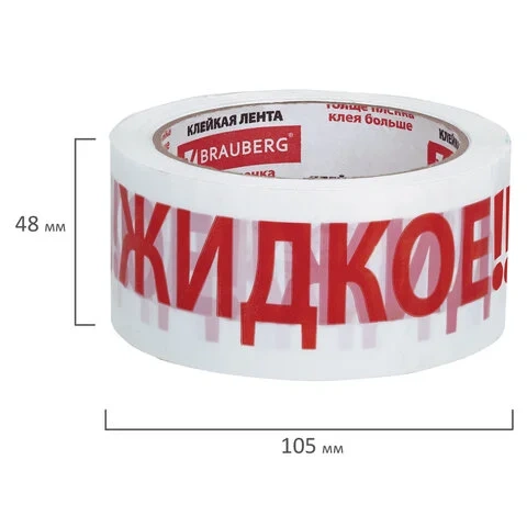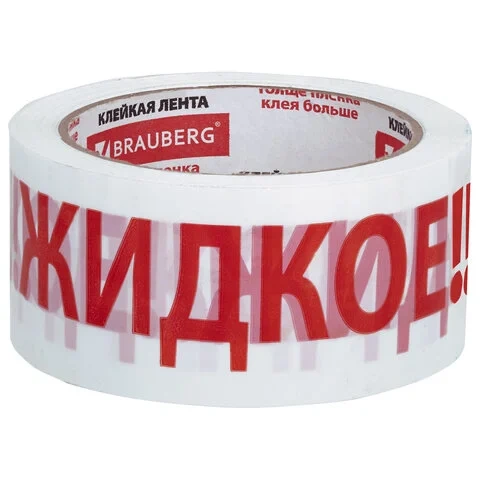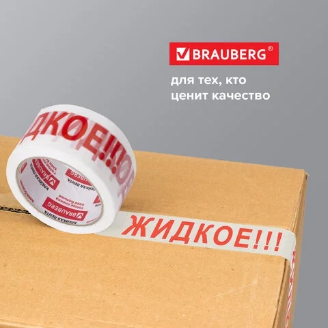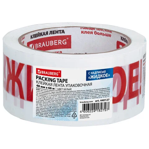 Клейкая лента упаковочная Brauberg 48ммх66м, белая, 45мкм, надпись Жидкое!!!