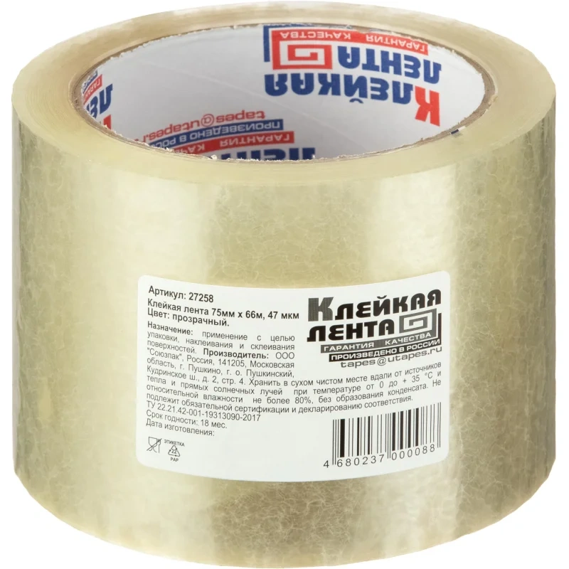 Упаковочная клейкая лента толщиной 47 мкм изготовлена на основе прозрачного полипропилена. Отличается высокой адгезией клея (слипанием с поверхностью), стойкостью к разрыву. Ширина ленты — 75 мм, длина рулона — 66 м. Широкая клейкая лента предназначена для упаковки объемных и тяжеловесных грузов, не теряет свойств на открытом воздухе при температуре от 10 до 30°C. Не хранить под прямыми солнечными лучами.