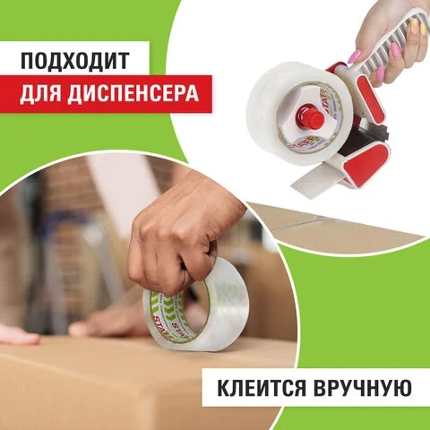 Толщина скотча 40 мкм позволяет переносить воздействие низких температур и влажности и выдерживать вес коробки 15-17 кг. Клейкой ленты шириной 50 мм и длиной намотки 66 м хватит на продолжительное время. Цвет - прозрачный.