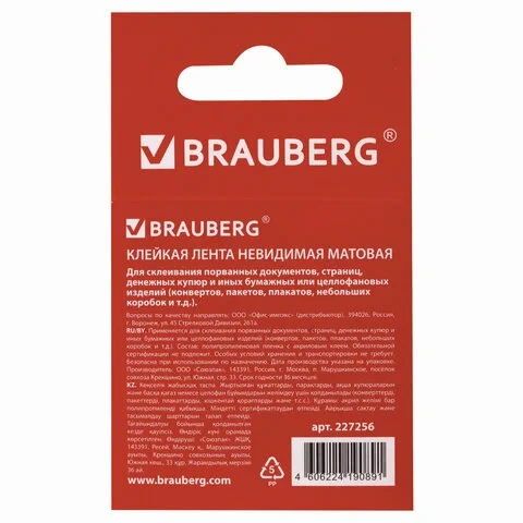 Канцелярская клейкая лента Brauberg 19мм х 33м, невидимая, матовая