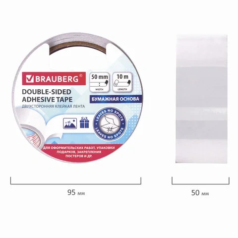 Клейкая двухсторонняя лента 50 мм х 10 м, БУМАЖНАЯ ОСНОВА, BRAUBERG, 229055