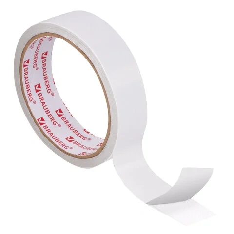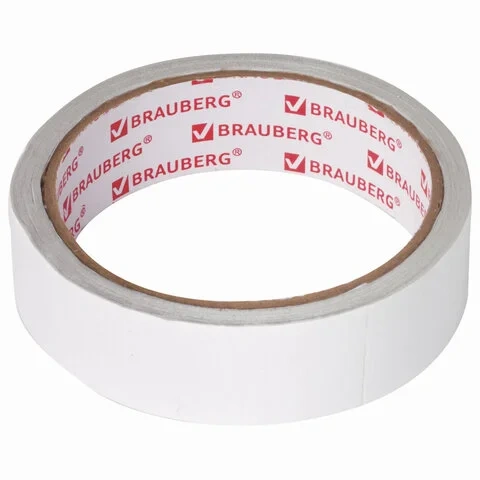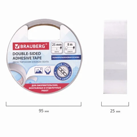 Клейкая двусторонняя лента 25 мм х 8 м, ТОНКАЯ ОСНОВА полипропилен, 90 микрон, BRAUBERG, 606425