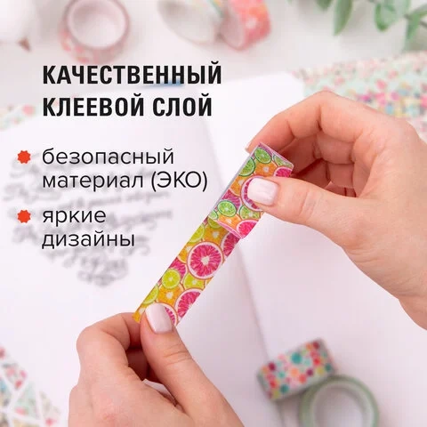 В наборе содержится 7 бумажных лент с яркими и сочными дизайнами на полупрозрачной клеевой основе, каждая из которых намотана на пластиковую втулку. Ширина ленты 15 мм позволяет наклеить её даже на небольшие поделки, а длина 3 м даёт большой простор для творчества.