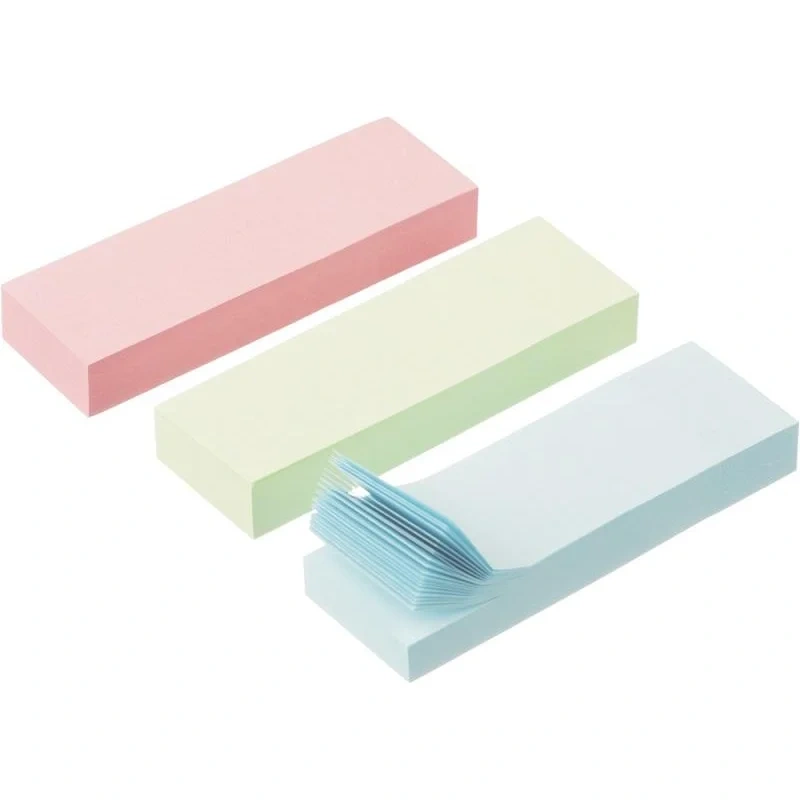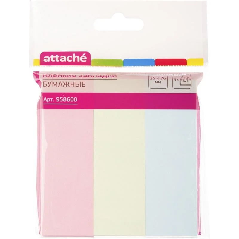 Бумажные клейкие закладки Attache. Закладки клейкие, ширина которых составляет 25 мм, могут служить закладками в документах, использоваться для записи краткой информации, для выделения текста. Клейкие закладки легко удаляются, не оставляя следов и не повреждая бумагу. Одну закладку можно использовать несколько раз. Размер одной закладки 25×76 мм. На закладках можно писать ручкой, чернографитовым карандашом, маркером, фломастером. В упаковке 3 пастельных цвета по 100 листов каждого цвета.